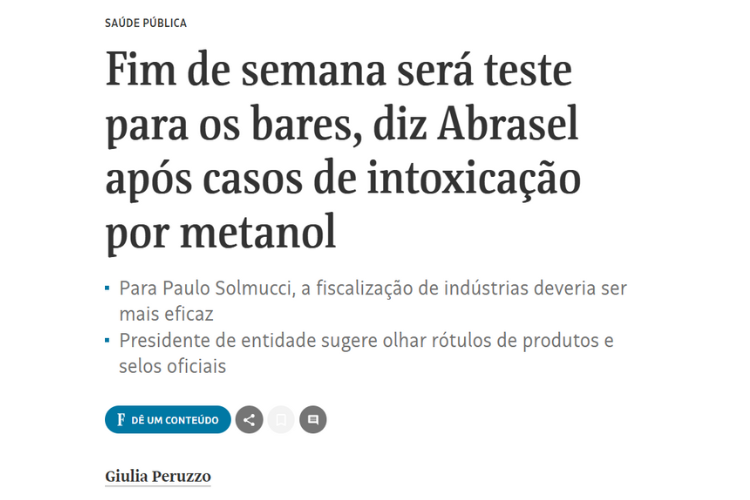 Após os recentes casos de intoxicação por bebidas adulteradas com metanol, a Abrasel intensificou ações de orientação para bares e consumidores. Segundo o presidente-executivo da entidade, Paulo Solmucci, ainda não houve impacto direto no faturamento dos estabelecimentos, mas o próximo fim de semana será um teste importante para avaliar possíveis efeitos da crise.